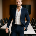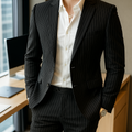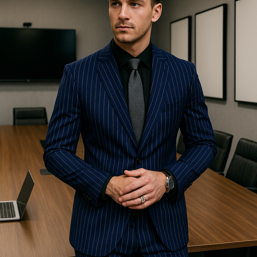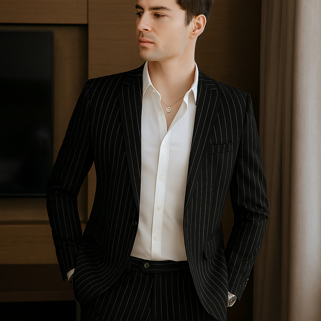 Refined pinstripes. Boardroom clarity. The Westminster is a modern two-piece cut for business and smart-casual wear through all four seasons. A single-breasted jacket with sharp notch lapels pairs with flat-front trousers for a clean, elongated line. The tightly woven performance fabric holds its shape from commute to last meeting.
