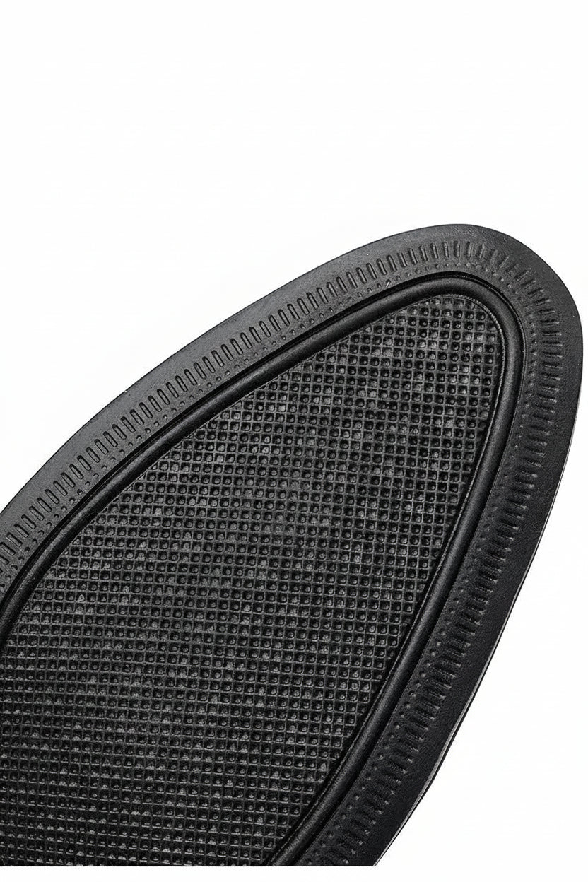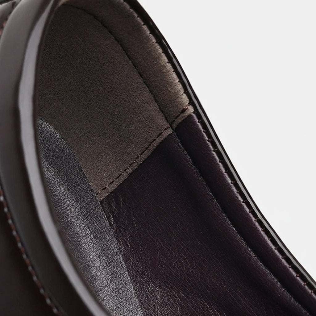 A sharp slip-on built for boardrooms and black-tie dinners. The St James pairs a high-shine tapered toe with a breathable lattice quarter and a refined saddle strap capped by a discreet metal clasp. The profile is sleek. The step is quiet and sure under a grippy rubber outsole. Dress authority without laces.