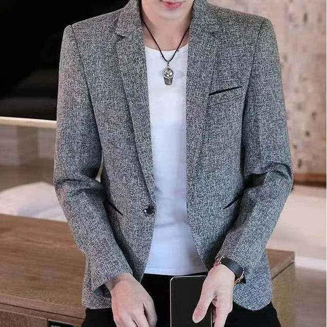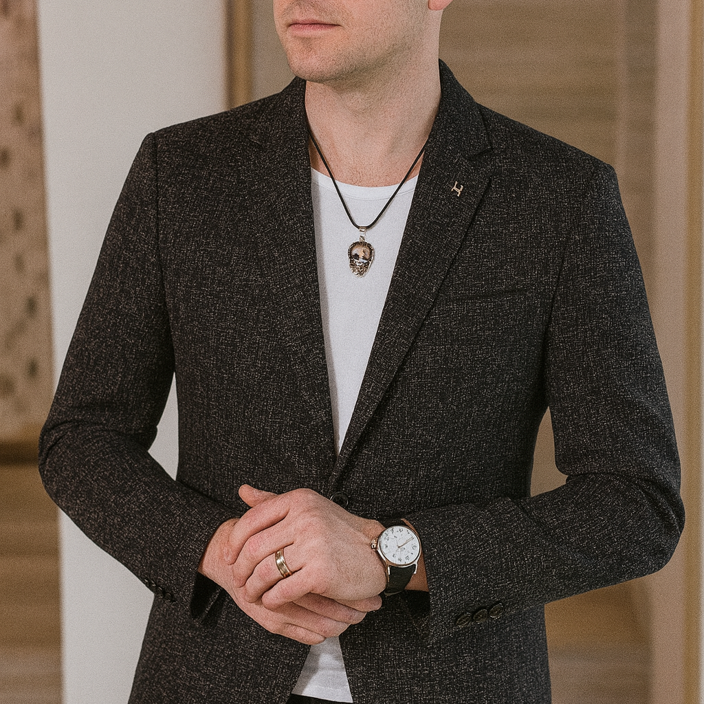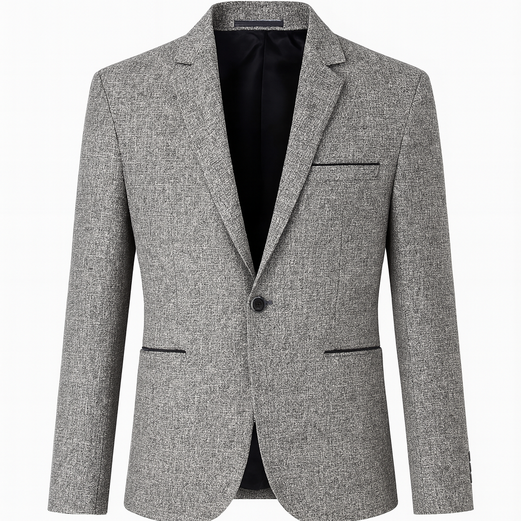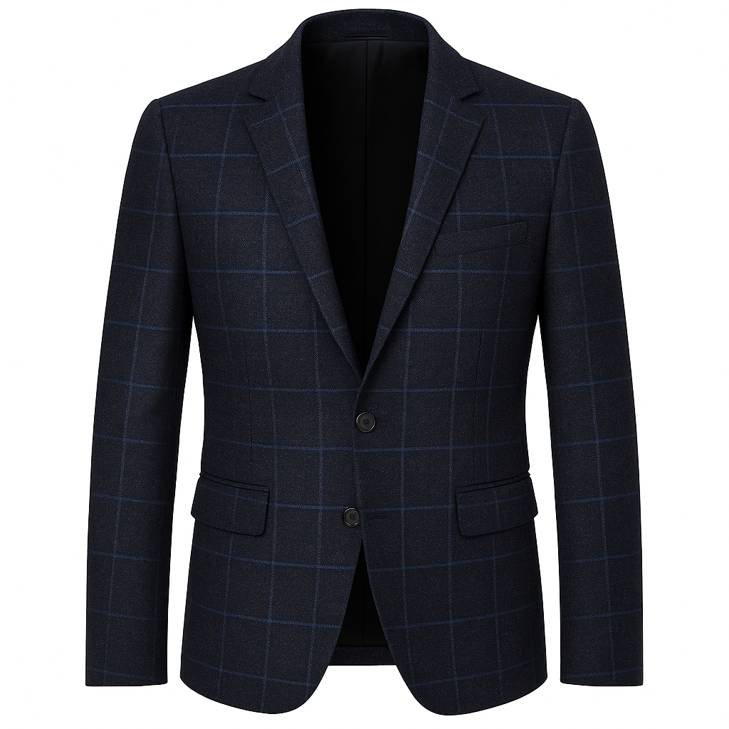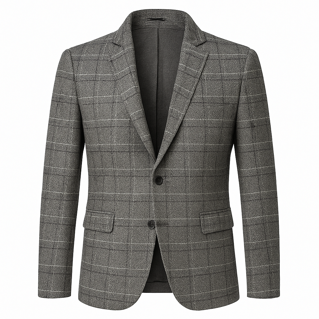 A refined grey check blazer for daily wear and city evenings. Tailored silhouette. Single-button front. Built for spring and autumn comfort.