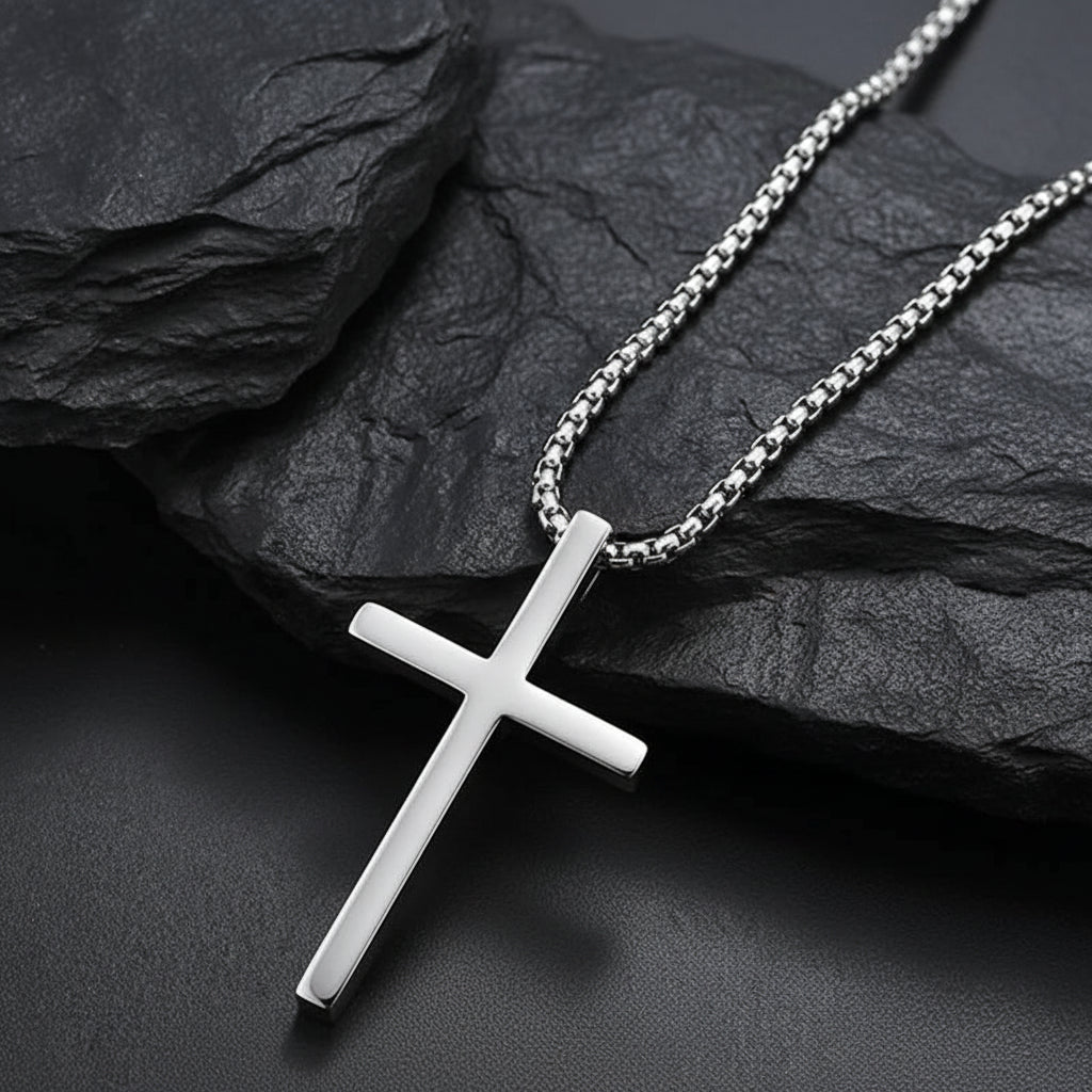 Minimal cross. Maximum clarity. The Regent Cross pairs a clean, mirror-polished pendant with a crisp box chain for an understated all-black or smart-casual look. Cut from hypoallergenic stainless steel, it holds its shine and resists tarnish through daily wear.
